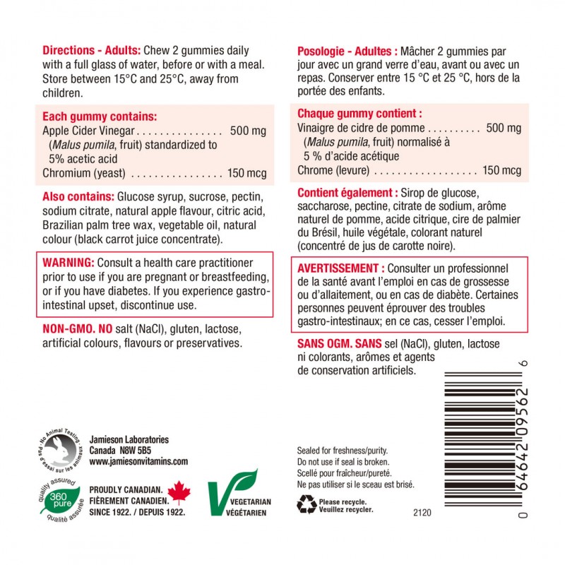 پاستیل های سرکه سیب جیمیسون با کروم فرموله شده اند که به متابولیسم چربی ها و حفظ سطح قند خون (گلوکز) سالم در بدن کمک می کند. این آدامس ها با طعم مفرح و خوشمزه سیب قرمز موجود هستند
