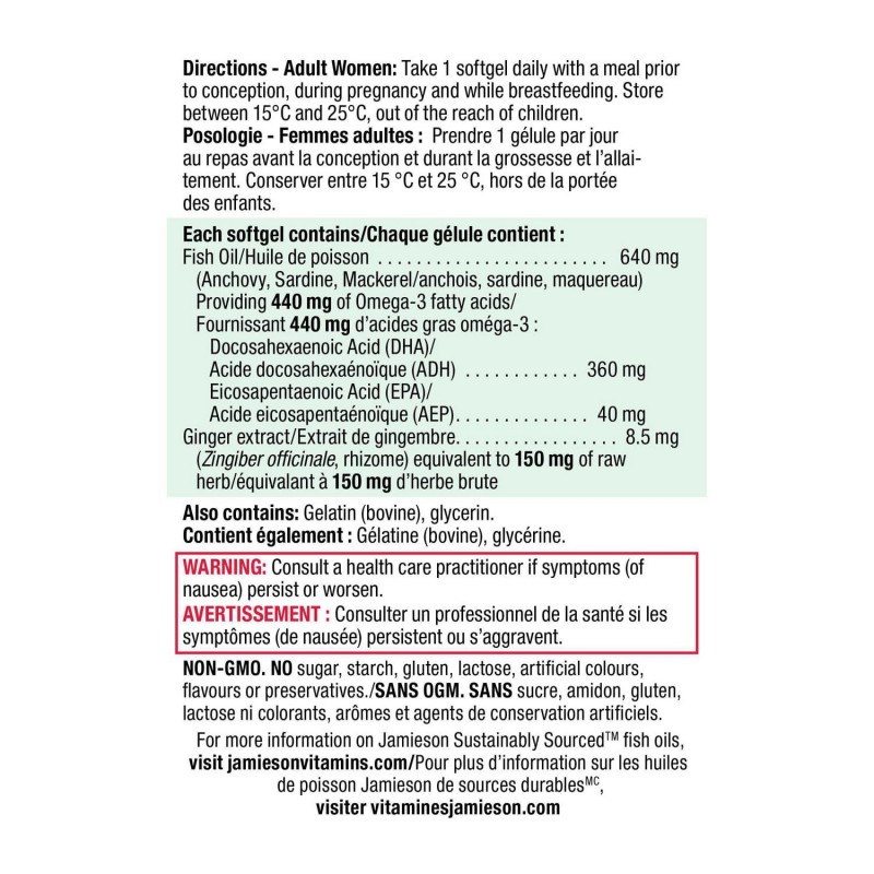 محصول کانادا حمایت قبل از تولد از رشد سالم مغز، چشم ها و اعصاب کودک شما حمایت می کند بدون مزه ماهی! 360 میلی گرم DHA و 40 میلی گرم EPA را فراهم می کند به علاوه 8.5 میلی گرم عصاره زنجبیل