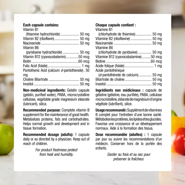 محصول کانادا - به بدن در متابولیسم پروتئین ها، چربی ها و کربوهیدرات ها کمک می کند از رشد و نمو طبیعی حمایت می کند حاوی خانواده کامل ویتامین های B است 50 میلی گرم از اکثر ویتامین های گروه B، به علاوه مواد مغذی حمایتی را فراهم می کند