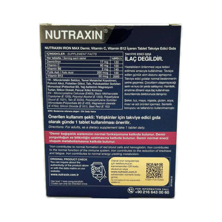 قرص آهن ایرون مکس نوتراکسین 30 عدد Nutraxin Vitals Iron Max حاوی 17 میلی گرم آهن آزاد شده به صورت بیس گلیسینات است. همچنین حاوی ویتامین های C، B12، B6 و اسید فولیک است.