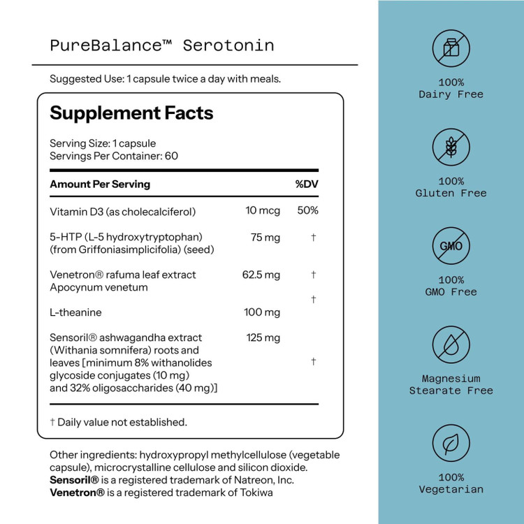 علاوه بر 5-HTP، سروتونین پیور بالانس™ شامل موادی است که عملکرد سروتونین را برای حمایت از خلق و خو، مدیریت استرس، کنترل وزن و خواب با کیفیت تقویت می کنند.