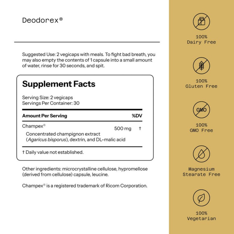 قارچ شامپینیون همچنین به عنوان قارچ دکمه ای سفید رایج (Agaricus bisporos) شناخته می شود. Champex®، یک عصاره انحصاری و اختصاصی شامپینیون، به گونه ای متمرکز شده است که حاوی طیف گسترده ای از ترکیبات مبارزه با بو، از جمله اسیدهای آمینه، پلی فنول ها و پلی ساکاریدها باشد.* موادی مانند آمونیاک، ایندول، مرکاپتان، سولفات هیدروژن و آمین را خنثی یا جذب می کند که هنگام تجزیه پروتئین در روده و خون تولید می شوند.