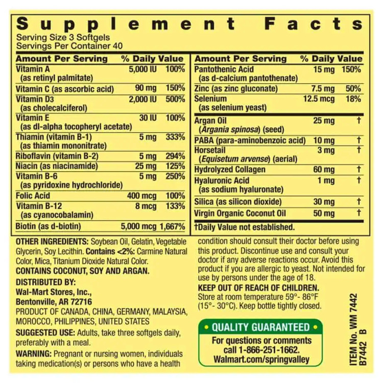 میزان مصرف پیشنهادی برای بزرگسالان سه ژل نرم در روز است که ترجیحاً همراه با غذا مصرف شود. می توانید مطمئن باشید که سافت ژل های پوست، مو و ناخن اسپرینگ والی 120 عددی با دستورالعمل های کیفیت دقیق تولید می شوند و با ضمانت کیفیت پشتیبانی می شوند.