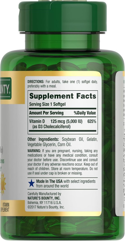 Nature’s Bounty Vitamin D3 5000 IU یک مکمل ایدهآل برای افرادی است که نیاز به تقویت سیستم ایمنی و بهبود سلامت استخوانها دارند. این محصول با فرمولاسیون جذب سریع، انتخابی عالی برای تأمین نیاز روزانه ویتامین D بدن است.