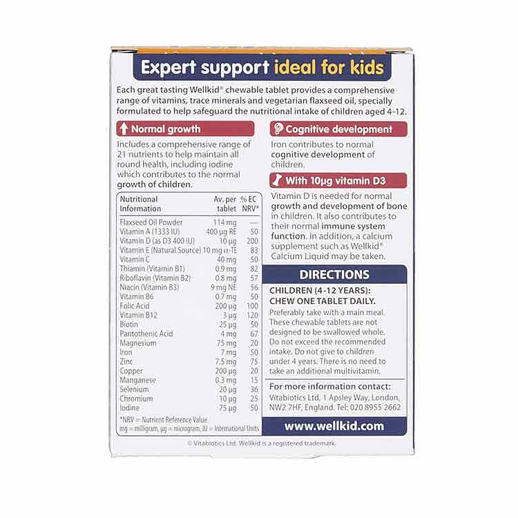 مولتی ویتامین جویدنی کودکان ول کید از محصولات برند ویتابیوتیکس انگلستان است که حاوی 21 ویتامین، ماده معدنی و مغذی به همراه روغن بذر کتان بوده و نقش کلیدی را در رشد جسمی، ذهنی، استخوانها و دندانهای کودکان 4 الی 12 سال ایفا خواهد کرد. این قرص جویدنی با تامین نیازهای تغذیه ای ضروری برای کودکان در سن رشد طراحی شده و جایگزینی مناسب برای رفع کمبودهای تغذیه ای ناشی از رژیم غذایی ناقص کودک می باشد.