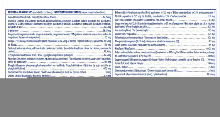 دی متیل آمینو اتانول (به عنوان بی تارتارات DMAE)، کولین (به عنوان بی تارترات کولین)، عصاره جینکو بیلوبا (برگ)، ال-گلوتامین، باکوپا (عصاره باکوپا موننیری؛ گیاه کامل)، اسید ال-پیروگلوتامیک، فسفاتیدیل سرین، کنسانتره اسید دوکوزاهگزانوئیک از DHA (15%) روغن بدن ماهی (آنچوی، ساردین و سالمون)، اینوزیتول، ان-استیل تیروزین، عصاره استاندارد میوه زغال اخته (25٪ آنتوسیانوزید)، اسید گاما آمینوبوتیریک، پوست انگور و عصاره هسته انگور، کنسانتره الکترولیت Trace-Lyte، هوپرزین A (عصاره هوپرزیا سراتا؛ اندام های هوایی)، بور (به عنوان سیترات بور) و وانادیم (به عنوان وانادیل سولفات).