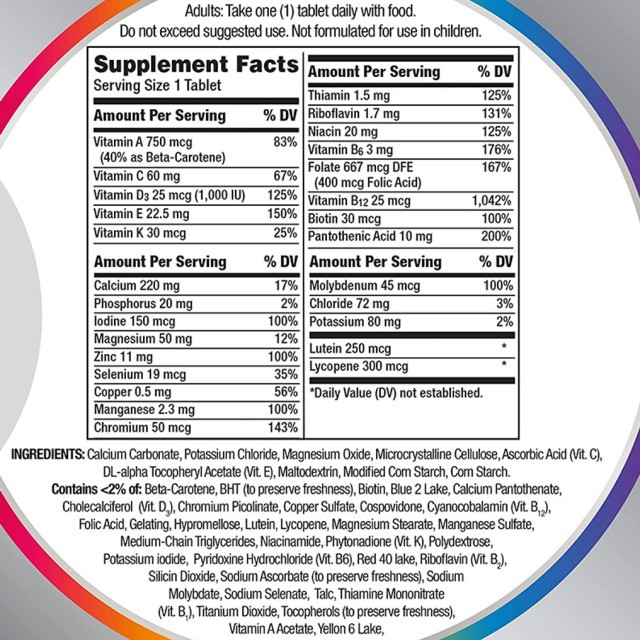 Calcium Carbonate, Potassium Chloride, Dibasic Calcium Phosphate, Magnesium Oxide, Microcrystalline Cellulose, Ascorbic Acid (Vit. C), Dl-Alpha Tocopheryl Acetate (Vit. E), Corn Starch, Pregelatinized Corn Starch, Modified Corn Starch. Contains <2% of: Beta-Carotene, BHT (to Retard Oxidation), Biotin, Blue 2 Lake, Calcium Pantothenate, Cholecalciferol (Vit. D3), Chromium Picolinate, Crospovidone, Cupric Sulfate, Cyanocobalamin (Vit. B12), Folic Acid, Gelatin, Hydrogenated Palm Oil, Lutein, Lycopene, Magnesium Borate, Magnesium Stearate, Maltodextrin, Manganese Sulfate, Niacinamide, Nickelous Sulfate, Vitamin K, Polyethylene Glycol, Polyvinyl Alcohol, Potassium Iodide, Pyridoxine, Hydrochloride, (Vit. B6), Red 40, Lake, Riboflavin (Vit. B2), Silicon Dioxide, Sodium Ascorbate (to Retard Oxidation), Sodium Borate, Sodium Metavanadate, Sodium Molybdate, Sodium Selenate, Talc, Thiamine Mononitrate (Vit. B1), Titanium Dioxide, Tocopherols (to Retard Oxidation), Vitamin A Acetate, Yellow 6 Lake, Zinc Oxide.
