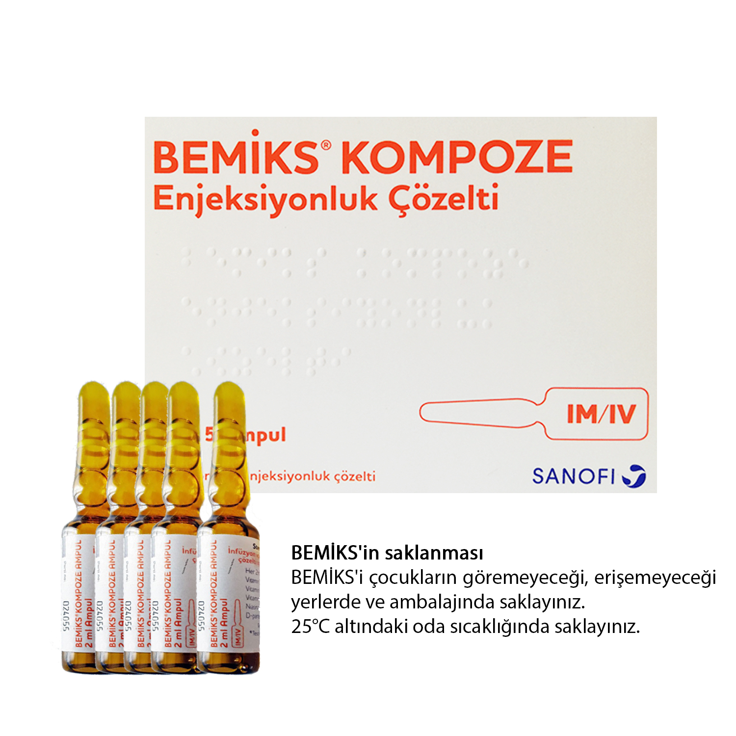 محلول ترکیبی BEMİKS® آمپول ب کمپلکس برای تزریق: به آرامی به عضله (داخل عضلانی) یا مایع (انفوزیون) تزریق می شود. اعمال می شود. استریل • ماده فعال: ۲۵ میلی گرم تیامین (B1)، ۲ میلی گرم ریبوفلاوین در هر ۲ میلی لیتر محلول تزریقی. (B2)، ۵ میلی گرم پیریدوکسین (B6)، ۵۰ میلی گرم نیاسینامید و D-panthenol • مواد کمکی: کلرید سدیم، فسفات سدیم، مونوهیدرات اسید سیتریک، پلی سوربات ۸۰، متیل پارابن، پروپیل پارابن، آب برای تزریق