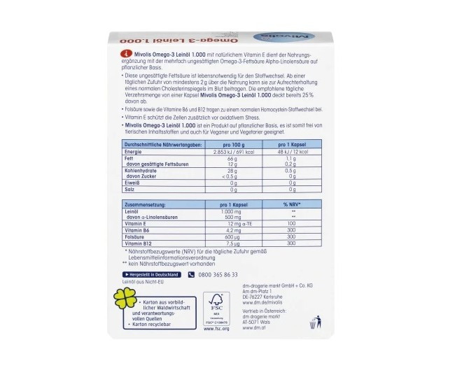 کپسول های 1000 میلی گرمی Mivolis Omega-3 حاوی ماهی دریایی و روغن ماهی قزل آلا ، غنی از اسیدهای چرب امگا 3 غیراشباع ، به ویژه دو اسید چرب ضروری EPA (اسید ایکوزاپنتانوئیک) و DHA (اسید دوکوزا هگزائونیک) هستند. اینها عملکردهای مختلفی در بدن انسان دارند ، به عنوان مثال. به عنوان مثال، برای قلب ماهی های دریایی به ویژه از نظر EPA و DHA غنی هستند و بنابراین باید به طور منظم مصرف شوند. از طرف دیگر ، کپسول های Mivolis Omega-3 1000 میلی گرم به اطمینان از تأمین این اسیدهای چرب کمک می کنند. با مصرف روزانه 250 میلی گرم EPA و DHA ، اینها به عملکرد طبیعی قلب کمک می کنند. کپسول های Mivolis Omega-3 1000 میلی گرم حاوی حداقل 260 میلی گرم اسیدهای چرب و همچنین ویتامین E هستند. این به محافظت از سلول ها در برابر استرس اکسیداتیو کمک می کند.