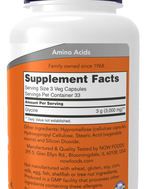 درجه دارویی، فرم آزاد خواب آرام را افزایش می دهد پشتیبانی از سیستم عصبی 3 گرم (3000 میلی گرم) گلیسین در هر سروینگ هر سروینگ برابر است با 3 کپسول 33 سروینگ 100 کپسول