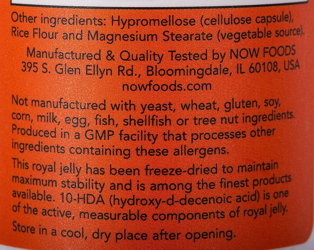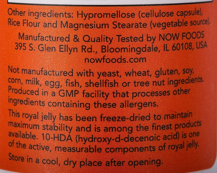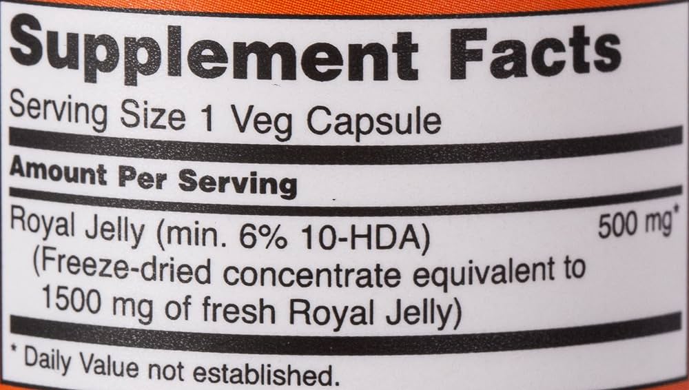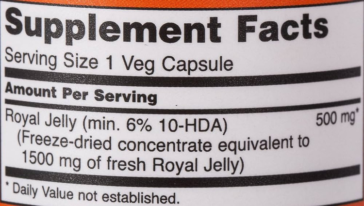 این ژل رویال برای حفظ حداکثر پایداری در انجماد خشک شده است و جزو بهترین محصولات موجود است. 10-HDA (هیدروکسی دی دسنوئیک اسید) یکی از اجزای فعال و قابل اندازه گیری ژل رویال است.