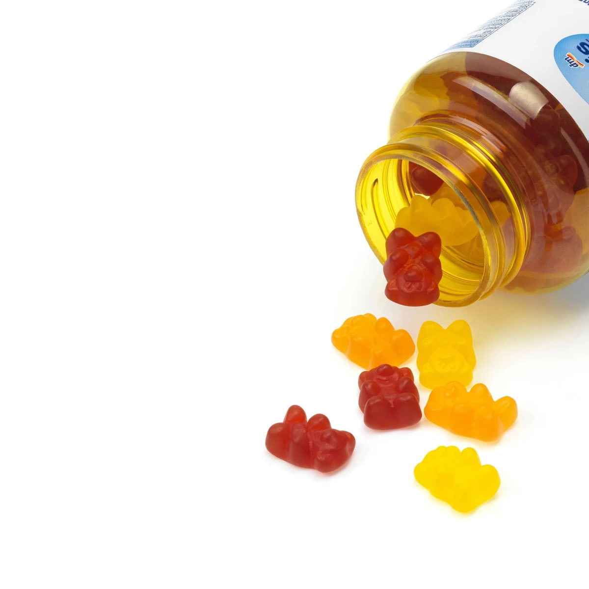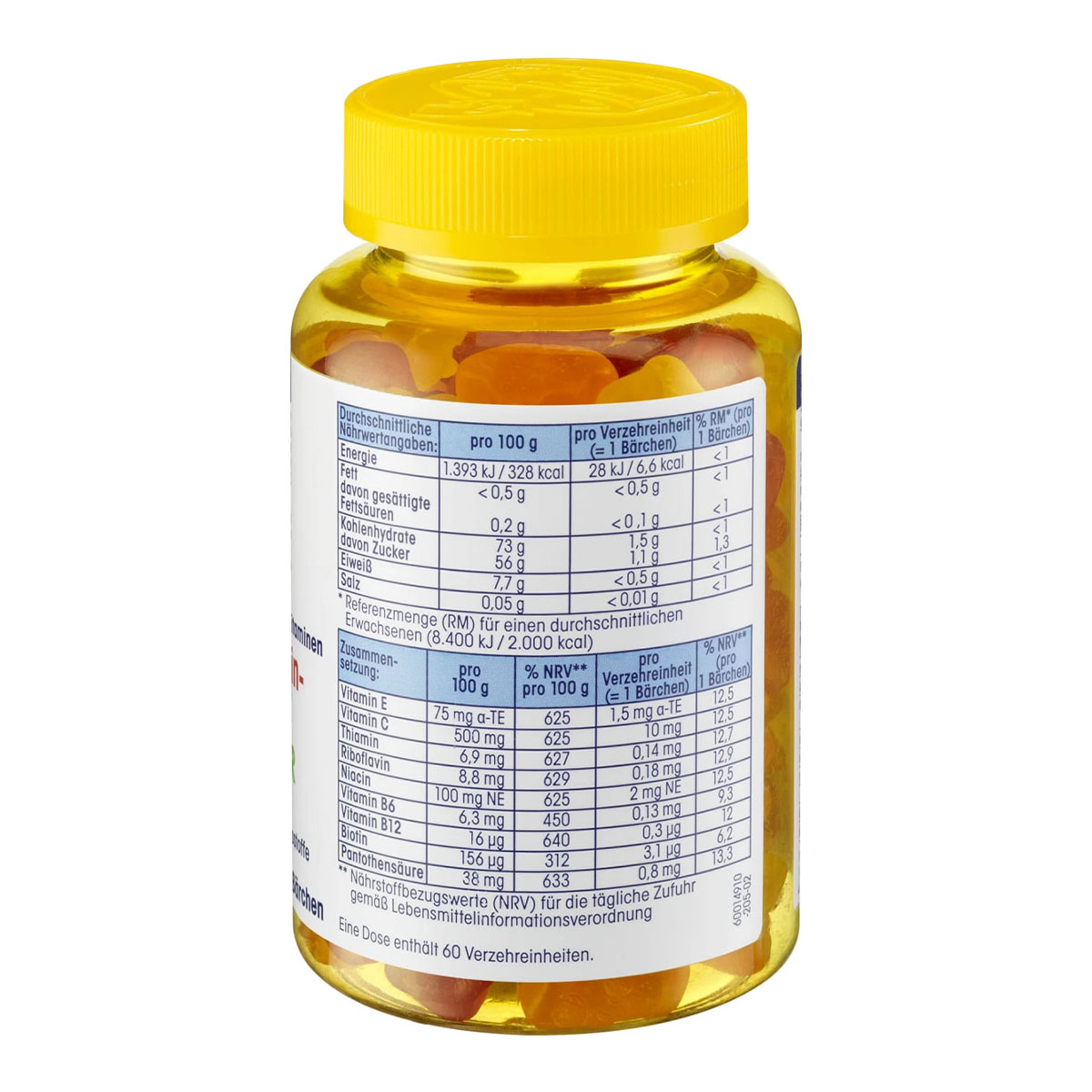 Fruit gums with vitamins sugar, glucose syrup, gelatin (pork), L-ascorbic acid (vitamin C), riboflavin (vitamin B2), nicotinamide (niacin), DL-alpha-tocopheryl acetate (vitamin E), pyridoxin hydrochloride (vitamin B6 ), thiamine hydrochloride (vitamin B1), biotin, calcium D-pantothenate (pantothenic acid), cyanocobalamin (vitamin B12), apple juice concentrate, coloring foods: safflower concentrate, black currant concentrate, carrot concentrate; natural tangerine flavor, natural lemon flavor, natural flavors, vegetable oils (coconut, rapeseed), coating agents: beeswax (white) and carnauba wax, acidulant: citric acid.