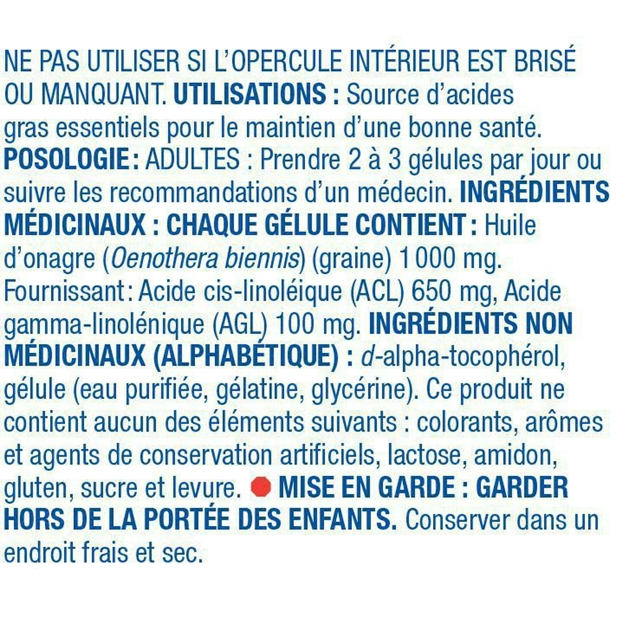 Fournissant: اسید سیس لینولئیک (ACL) 650 میلی گرم، اسید گاما لینولنیک (AGL) 100 میلی گرم. مواد تشکیل دهنده غیر دارویی (ALPHABÉTIQUE): d-alpha-tocophérol، gélule (eau purifiée، ژلاتین، گلیسیرین). این محصولات از ترکیبات سوئیفنتها: رنگها، آرومها و عوامل مصنوعات حفاظتی، لاکتوز، آمیدون، گلوتن، سوکر و لوور تولید میشود. • MISE EN GARDE : GARDER HORS DE LA PORTÉE DES ENFANTS. Conserver dans un endroit frais et sec.