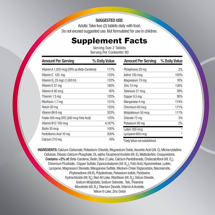 کربنات کلسیم، اسید اسکوربیک (ویتامین C)، اکسید منیزیم، کلرید پتاسیم، سلولز میکروکریستالی، فسفات کلسیم دی بازیک، DL-آلفا توکوفریل استات (ویتامین E)، اکسید روی. حاوی کمتر از 2% از: بتاکاروتن، بیوتین، پانتوتنات کلسیم، کوله کلسیفرول (ویتامین D3)، کروم پیکولینات، سولفات مس، کراسپوویدون، سیانوکوبالامین (ویتامین B12)، فومارات آهن، اسید فولیک، لسیتین (سوی)، لیکوپن استئارات منیزیم، سولفات منگنز، نیاسینامید، فیتونادیون (ویتامین K)، پلی اتیلن گلیکول، پلی وینیل الکل، یدید پتاسیم، هیدروکلراید پیریدوکسین (ویتامین B6)، رد 40 لیک، ریبوفلاوین (ویتامین B2، سدیم دی اکسیدی، سدیم دی اکسید) سلنات، تالک، تیامین مونونیترات (ویتامین B1)، دی اکسید تیتانیوم، ویتامین A استات، زرد 6 لیک. حاوی: سویا