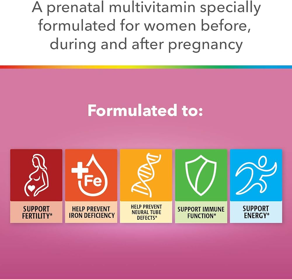 ویتامین ها و مواد معدنی ضروری: مولتی ویتامین Centrum Prenatal حاوی 23 ویتامین و مواد معدنی ضروری از جمله اسید فولیک، آهن، کلسیم، ویتامین B و ویتامین D برای کمک به باروری، کاهش خستگی و خستگی ناشی از کم خونی فقر آهن و حمایت از انرژی است.