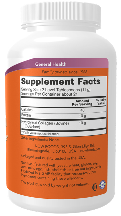 پپتیدهای کلاژن ناو Now Collagen Peptides Powder یک مکمل به شکل پودر است که پپتیدهای کلاژن از نوع 1 و 3 را ارائه می دهد. کلاژن گاوی به دلیل نقش خود در سلامت استخوان، مفاصل و پوست به خوبی شناخته شده اند. مطالعات نشان می دهد که کلاژن هیدرولیز شده ممکن است به حمایت از استخوان های قوی و مفاصل سالم و همچنین صافی و آبرسانی پوست کمک کند.