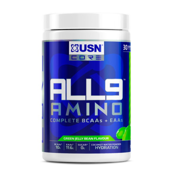 آمینو یو اس ان آل 9 آمینو USN All 9 Amino یک مکمل کامل برای هیدراتاسیون، استقامت و ریکاوری عضلات بدون چربی است. آل 9 آمینو یک مکمل هیدراتاسیون و ریکاوری عضلانی بدون قند با نسبت 2:1:1 از 5 گرم بی سی ای ای تخمیر شده طبیعی و اسیدهای آمینه ضروری اضافی است. ال ۹ آمینوحاوی پودر آب نارگیل و الکترولیت برای هیدراتاسیون و عملکرد عصبی و همچنین تائورین و گلوتامین برای افزایش عملکرد فیزیکی است. آل 9 آمینو توسط Informed-Choice.org تایید شده است.