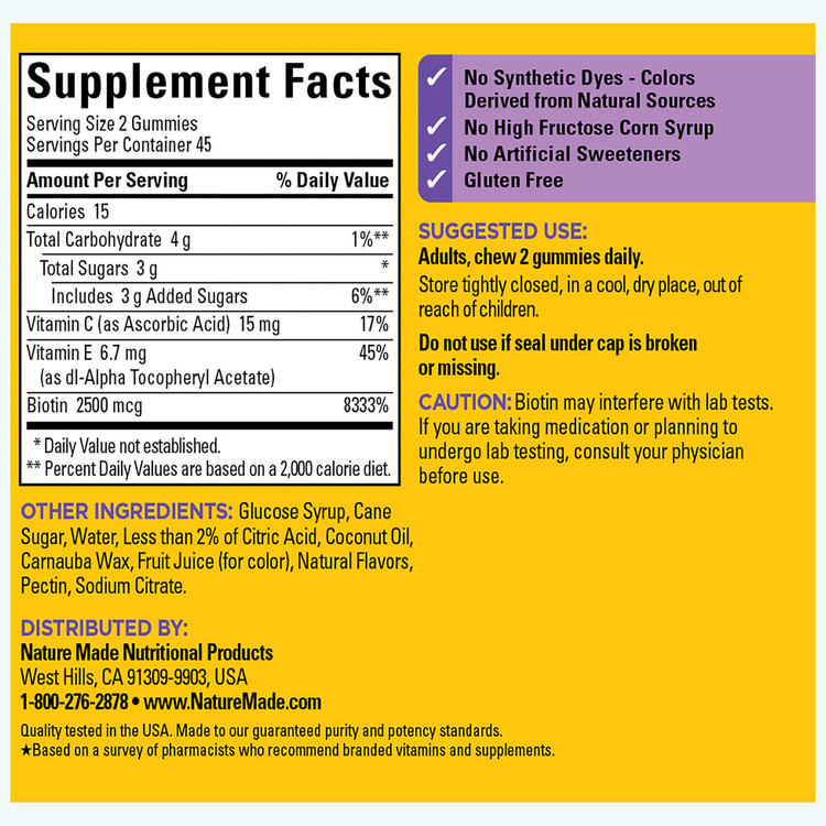 تقویت موی سر و جلوگیری از ریزش مو کمک به سلامت پوست و کلاژنساز تقویت و سلامتی ناخنها حاوی انواع مواد معدنی و ویتامینها حاوی بیوتین، زینک، ویتامین آ، ویتامین ث مصرف روزانه ۱ عدد برند نیچرمید ساخت آمریکا
